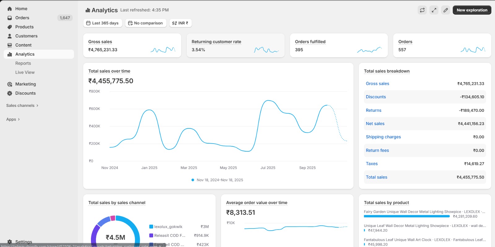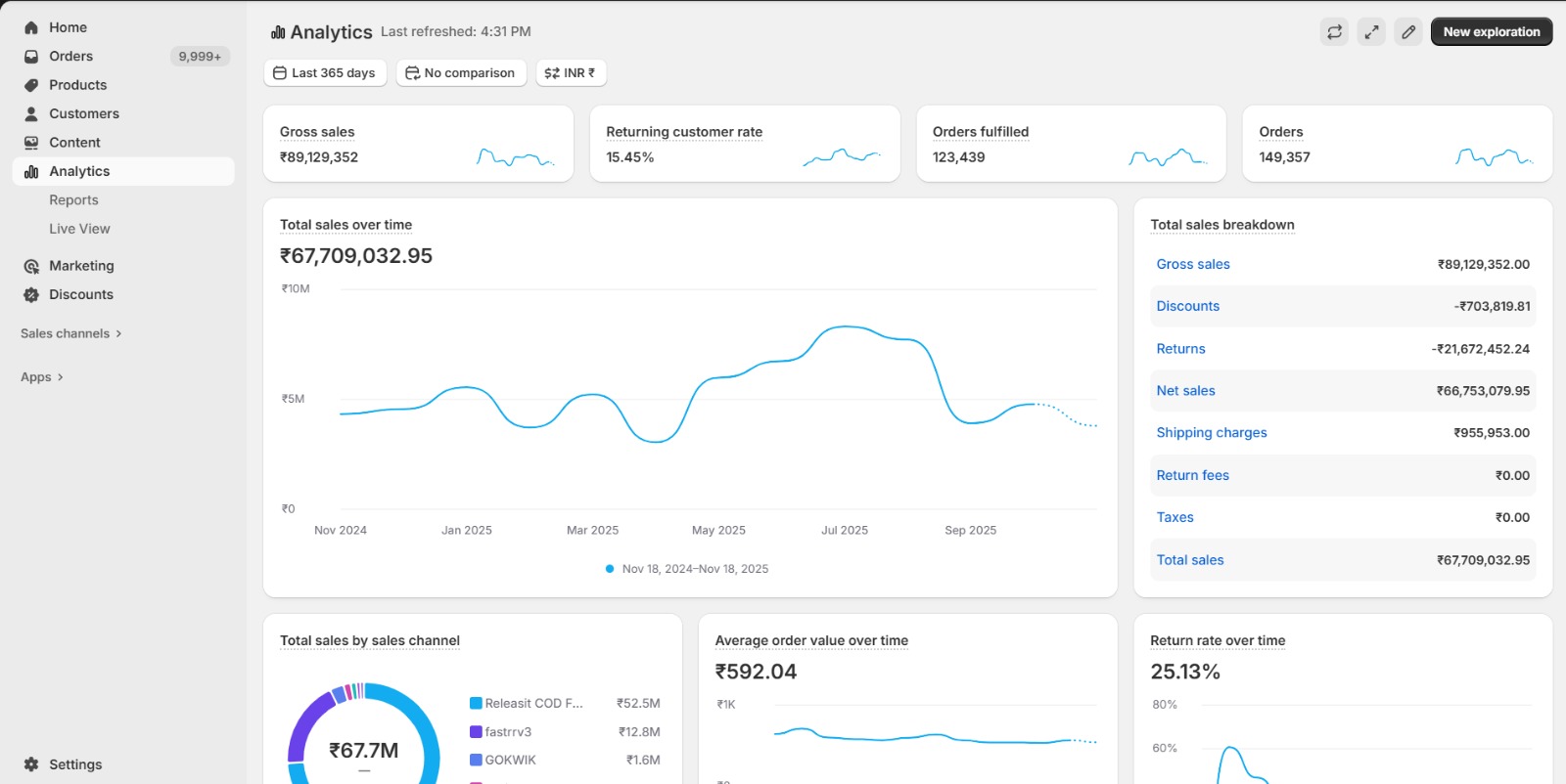 Scaled ad spend from ₹3 lakh/month to ₹1.5 crore/year, driving ₹6.7 crore in annual revenue, 1.49 lakh orders, ₹592 AOV, 15.45% returning customers, and a controlled 25.13% return rate with stable profitability throughout.
