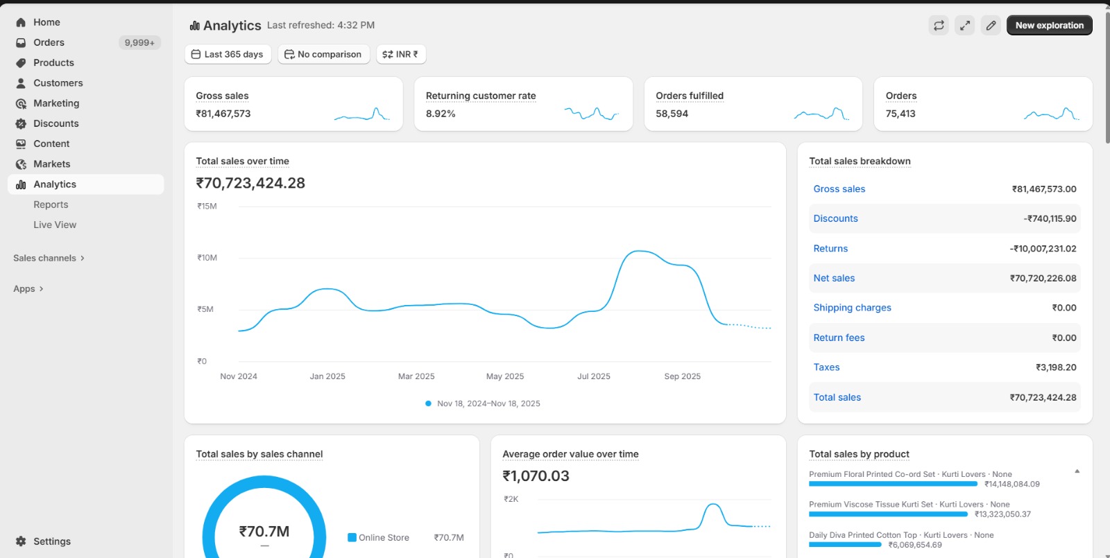 We grew the fashion brand to ₹7.07 crores in revenue, maintained a 4.5–5X ROAS, fulfilled over 58,594 orders, and achieved an average order value of ₹1,070 while stabilising profitability.